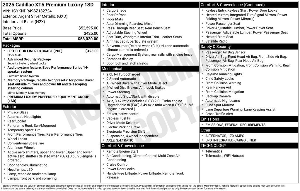 Argent Silver Metallic 2025 Cadillac XT5 Premium Luxury AWD 9-Speed Automatic 2.0L Turbocharged21/27 City/Highway MPG