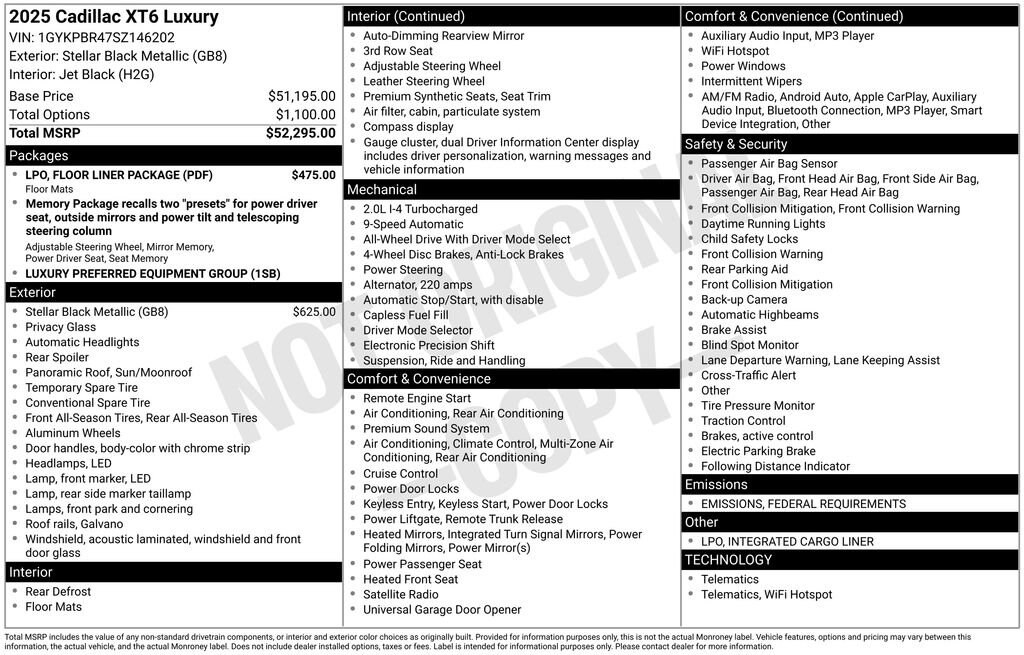 Stellar Black Metallic 2025 Cadillac XT6 Luxury AWD 9-Speed Automatic 2.0L Turbocharged21/26 City/Highway MPG