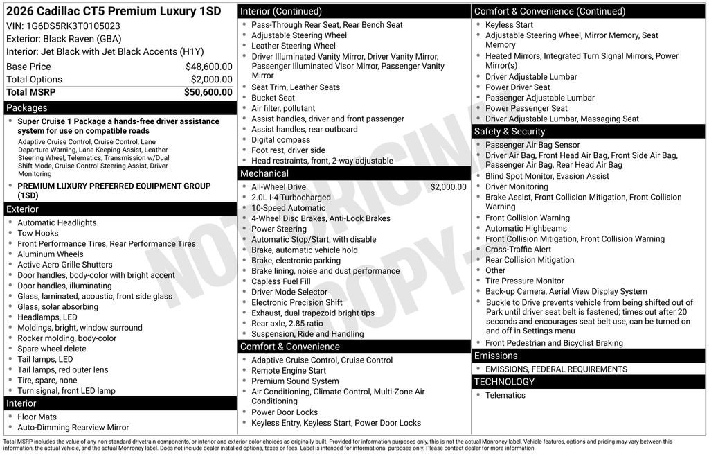 Black Raven 2026 Cadillac CT5 Premium Luxury RWD 10-Speed Automatic 2.0L I4 Turbocharged DOHC 16V LEV3-SULEV30 237hp