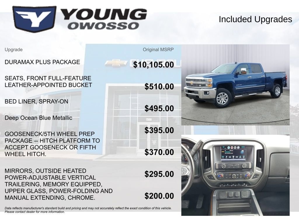 Priced below KBB Fair Purchase Price!LOCAL TRADE!, CARFAX ONE OWNER!, CLEAN CARFAX!, Silverado 2500HD LTZ, Duramax 6.6L V8 Turbodiesel, Allison 1000 6-Speed Automatic, 4WD, 110-Volt AC Power Outlet, 3.73 Rear Axle Ratio, 4.2 Diagonal Color Display Driver Info Center, 6-Speaker Audio System, Auto-Dimming Inside Rear-View Mirror, Chrome Bodyside Moldings, Chrome Door Handles, Chrome Mirror Caps, Color-Keyed Carpeting Floor Covering, Deep-Tinted Glass, Digital Steering Assist, Driver & Front Passenger Vanity Mirror Visors, Dual-Zone Automatic Climate Control, Duramax Plus Package, Electric Rear-Window Defogger, Electronic Shift Transfer Case, Engine Block Heater, EZ-Lift & Lower Tailgate, Front Halogen Fog Lamps, Gooseneck/5th Wheel Prep Package, HD Radio, Heated Power-Adjustable Outside Mirrors, Heavy-Duty Trailering Equipment, Integrated Trailer Brake Controller, Leather-Wrapped Steering Wheel, LTZ Plus Package, Manual Tilt-Wheel/Telescoping Steering Column, OnStar 4G LTE Wi-Fi Hotspot, OnStar 6 Month Guidance Plan, Power Sliding Rear Window w/Defogger, Power Windows w/Driver Express Up & Down, Power-Adjustable Pedals For Accelerator & Brake, Preferred Equipment Group 1LZ, Radio: AM/FM Stereo w/Chevrolet MyLink/Navigation, Rear 60/40 Folding Bench Seat (Folds Up), Rear Vision Camera w/Dynamic Guide Lines, Rear Wheelhouse Liners, Remote Keyless Entry, Remote Locking Tailgate, Remote Vehicle Starter System, Single Slot CD/MP3 Player, SiriusXM Satellite Radio, Standard Suspension Package, Steering Wheel Audio Controls, Unauthorized EntryTheft Deterrent System, Universal Home Remote.Reviews:* Impressive hauling and towing capabilities; refined and quiet ride; strong diesel engine; available CNG fueling for regular V8; solid build quality. Source: Edmunds