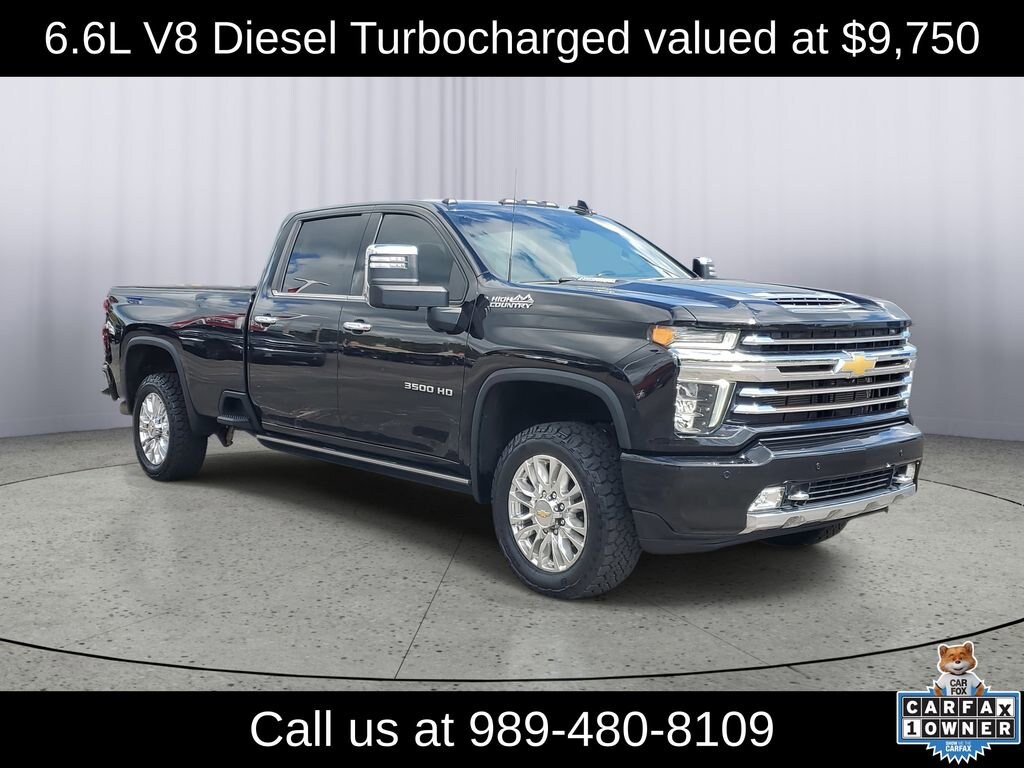 LOCAL TRADE!, NEW TIRES!, CARFAX ONE OWNER!, CLEAN CARFAX!, Silverado 3500HD High Country, Duramax 6.6L V8 Turbodiesel, 10-Speed Automatic, 4WD, Jet Black/Umber Leather, 12-Volt Rear Auxiliary Power Outlet, 120-Volt Bed Mounted Power Outlet, 120-Volt Instrument Panel Power Outlet, 170 Amp Alternator, 220 Amp Alternator, 2nd Row Dual USB Charge-Only Ports, 6 Rectangular Chromed Tubular Assist Steps, 8 Driver Information Center, Advanced Trailering System, Auto-Dimming Inside Rear-View Mirror, Automatic Emergency Braking, Bed View Camera w/2 Trailer Camera Provisions, Bluetooth® For Phone, Chevrolet Connected Access Capable, Chevytec Spray-On Black Bedliner w/Chevrolet Logo, Chrome Front Grille Bar w/Chrome Grille Inserts, Chrome Mirror Caps, Color-Keyed Carpeting Floor Covering, Compass Located In Instrument Cluster, Deep-Tinted Glass, Electric Rear-Window Defogger, Electrical Lock Control Steering Column, Following Distance Indicator, Forward Collision Alert, Front Carpeted Floor Mats, Front Chrome Recovery Hooks, Front LED Fog Lamps, Gooseneck/5th Wheel Prep Package, HD Surround Vision w/2 Trailer View Camera Provisions, Heated Steering Wheel, Hitch Guidance w/Hitch View, Integrated Trailer Brake Controller, IntelliBeam Automatic High Beam On/Off, Keyless Open & Start, Lane Change Alert w/Side Blind Zone Alert, Lane Departure Warning System, Leather-Wrapped Steering Wheel, LED Cargo Area Lighting, Manual Tilt/Telescoping Steering Column, OnStar & Chevrolet Connected Services Capable, Polished Exhaust Tip, Power Door Locks, Power Front Passenger Windows w/Express Up/Down, Power Front Windows w/Driver Express Up/Down, Power Rear Windows w/Express Down, Power Sliding Rear Window w/Defogger, Power-Adjustable Outside Mirrors, Preferred Equipment Group 3LZ, Rear Carpeted Floor Mats, Rear Cross Traffic Alert, Remote Vehicle Starter System, Safety Alert Seat, Safety Package II, SiriusXM w/360L, Snow Plow Prep/Camper Package, Standard Tailgate, Steering Wheel Audio Controls, Steering Wheel Mounted Electronic Cruise Control, Suspension Package, Unauthorized Entry Theft-Deterrent System, Universal Home Remote, Up-Level Rear Seat w/Storage Package, Wi-Fi Hotspot Capable, Wireless Charging, Wireless Phone Projection.
