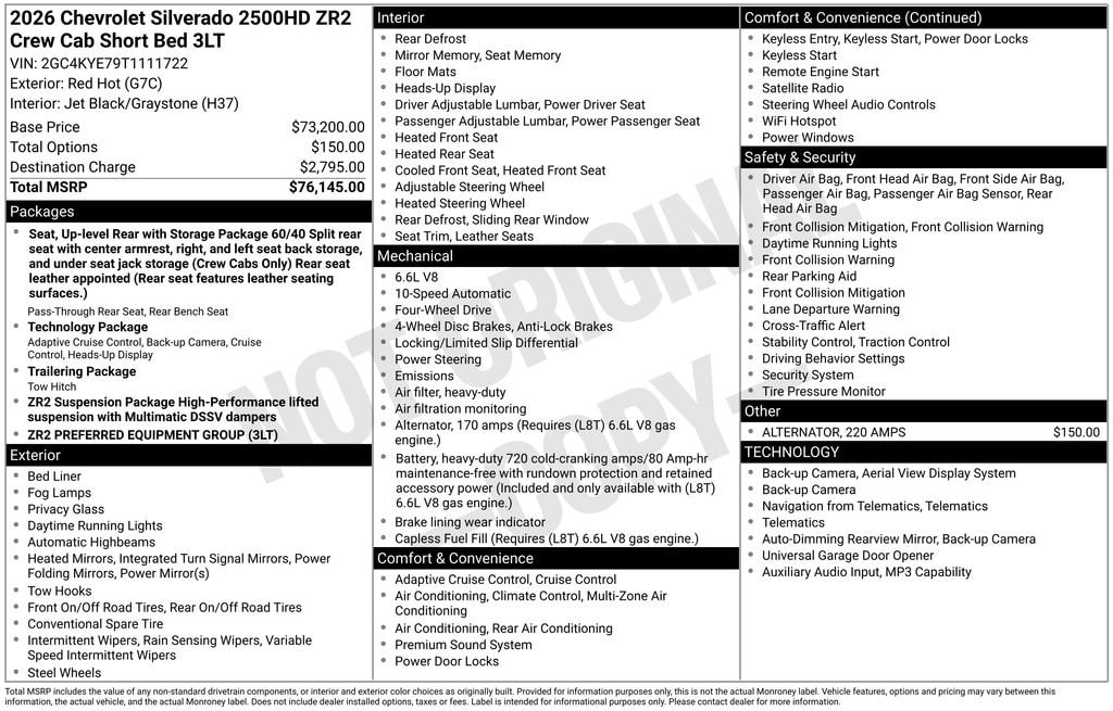 LOCAL TRADE!, Silverado 2500HD ZR2, 4D Crew Cab, 6.6L V8, 10-Speed Automatic, 4WD, 120-Volt Bed Mounted Power Outlet, 120-Volt Interior Power Outlet, 15 Diagonal Multicolor Head-Up Display, 170 Amp Alternator, 3.73 Rear Axle Ratio, All-Weather Floor Liners, Bed View Camera with Two Trailer Camera Provisions, Black Chevytec Spray-on Bedliner, Bluetooth® For Phone, BOSE Premium 7-Speaker Sound System, Chevrolet Connected Access Capable, Color-Keyed Carpeting Floor Covering, Compass, Deep-Tinted Glass, Durabed Pickup Bed, Electric Rear-Window Defogger, EZ Lift Power Lock and Release Tailgate, Front Bucket Seats, Front LED Fog Lamps, Front Rain-Sensing Wipers, Heated 2nd Row Outboard Seats, Heated Steering Wheel, High Gloss Black Mirror Caps, Hitch Guidance with Hitch View, in-Vehicle Trailering App System, Keyless Open and Start, LED Cargo Area Lighting, LED Smoked Amber Roof Marker Lamps, Manual Tilt and Telescoping Steering Column, Multi-Flex Tailgate, OnStar Services Capable, Perforated Leather Seat Trim, Power Door Locks, Power Front Windows with Driver Express Up/Down, Power Front Windows with Passenger Express Up/Down, Power Rear Windows with Express Down, Power Sliding Rear Window with Defogger, Preferred Equipment Group 3LT, Push Button Start, Rear Camera Mirror, Rear Cross Traffic Alert, Rear Wheelhouse Liners, Remote Vehicle Starter System, SiriusXM with 360L Trial Subscription, Steering Wheel Audio Controls, Technology Package, Trailer Camera Provisions, Ultrasonic Front and Rear Park Assist, Unauthorized Entry Theft-Deterrent System, Universal Home Remote, Up-Level Rear Seat with Storage Package, Wi-Fi Hotspot Capable, Wireless Charging, Wireless Phone Projection, Wrapped Steering Wheel, ZR2 Suspension Package.